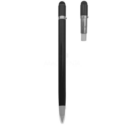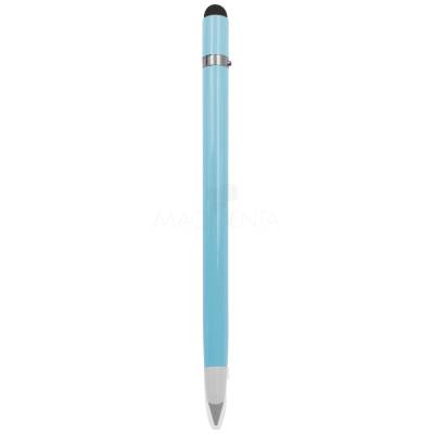 Caneta sem tinta com ponta de liga metálica com grafite que não desgasta e não precisa apontar, pode ser apagado com borracha comum.