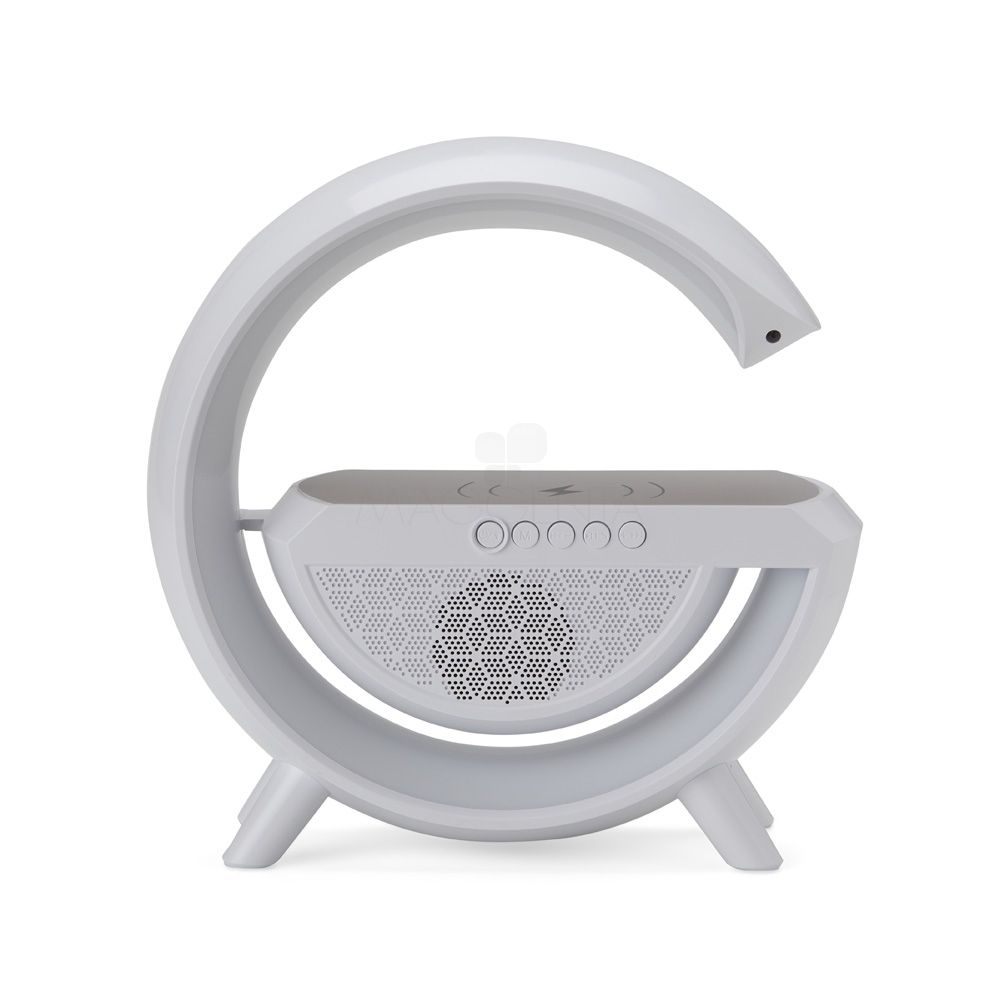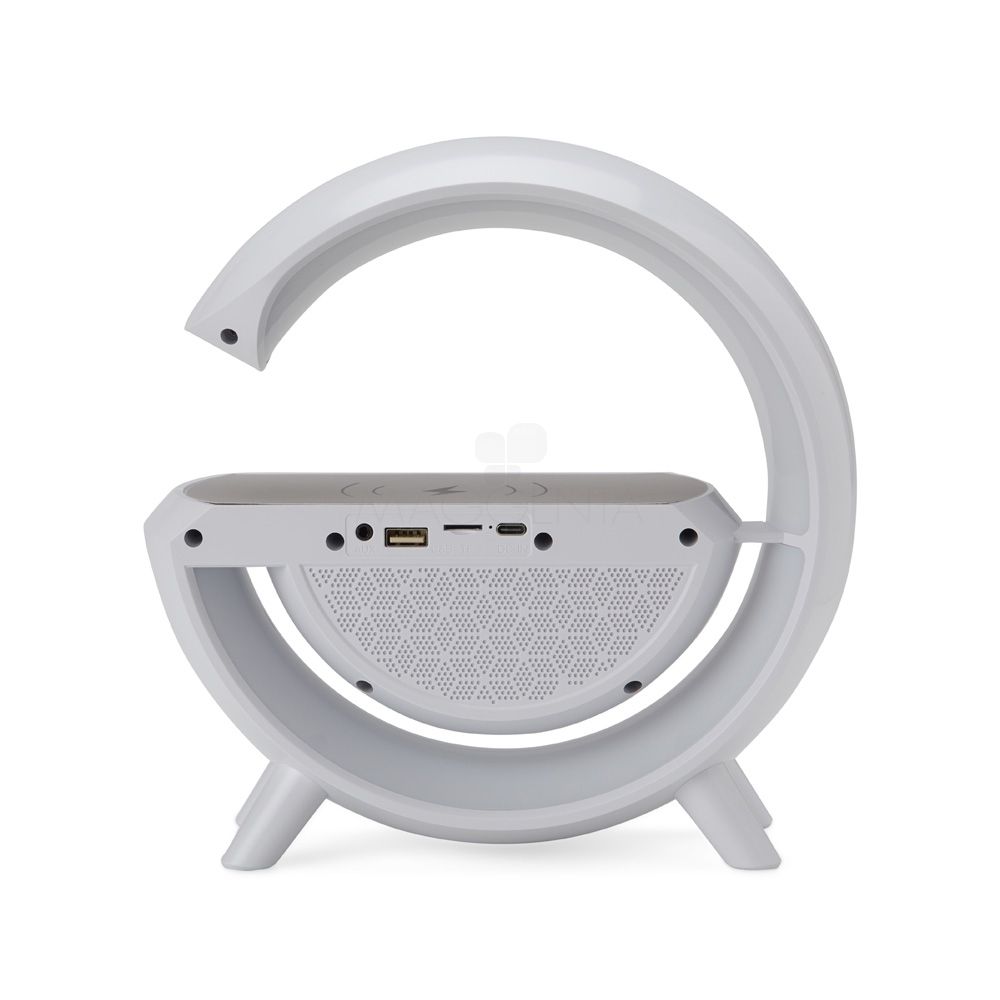 Caixa de som com carregador por indução e luminária. Possui 6 modos de iluminação, opera nos modos bluetooth, rádio FM, auxiliar P2, USB e TF (cartão MicroSD). Para desfrutar do carregamento por indução (sem fio) é fundamental que o celular possua a tecnologia QI, o produto só armazena bateria para funcionamento próprio, para funcionar a indução precisa estar conectado a uma fonte de energia.
