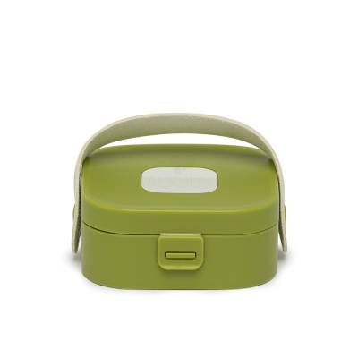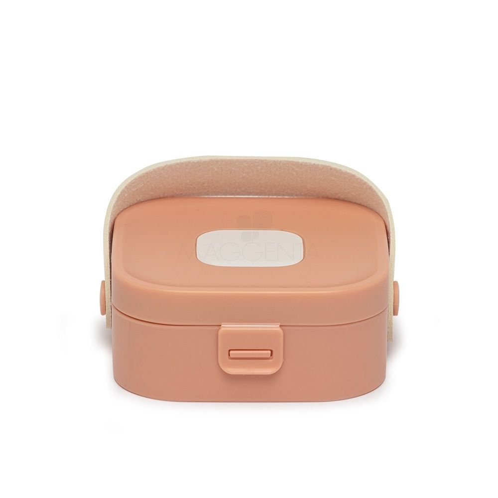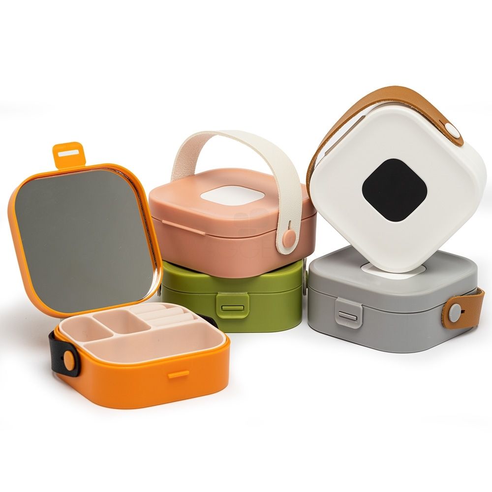 Porta-joias com espelho, produzido em plástico com alça de couro sintético e berço de silicone removível.