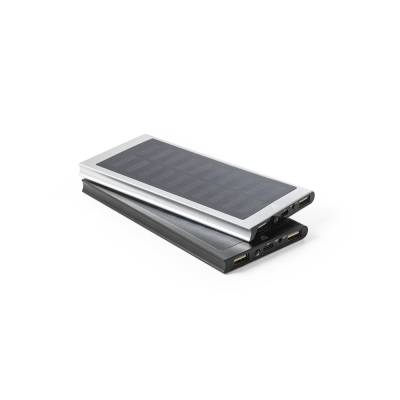 Bateria portátil em alumínio 100% reciclado. Bateria em lítio, com painel solar e lanterna. Tem capacidade de 8.000 mAh e tempo de vida superior a 500 ciclos. Possui uma porta de entrada e saída USB-C e duas portas de saída USB-A. Incluso cabo USB-C para carregamento com cerca de 30 cm. Ideal para situações de emergência. Fornecido em caixa presente em papel kraft.