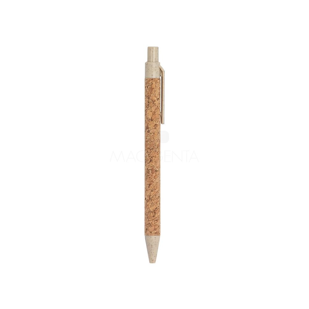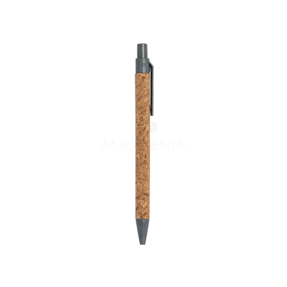 Caneta de cortiça com carga esferográfica azul 1.0mm e acionamento por clique. Clipe plástico, acionador e ponteira plástica.