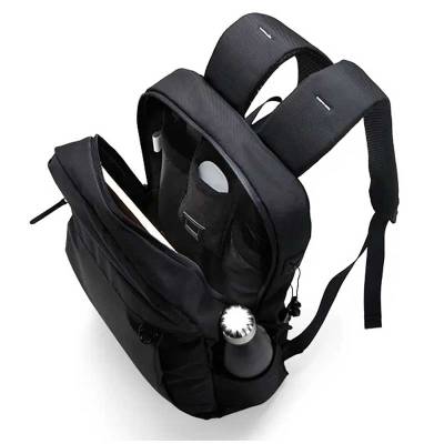 Mochila preta em Polyester / PU. Conta com alças para as costas, alça para as mãos e alça carona para mala. Na parte externa conta com saída para fio, dois bolsos laterais, um na parte frontal com zíper simples e o principal na parte superior, com fechamento em zíper duplo cursor. Na parte interna, conta com compartimento aveludado para notebook e mais seis compartimentos.