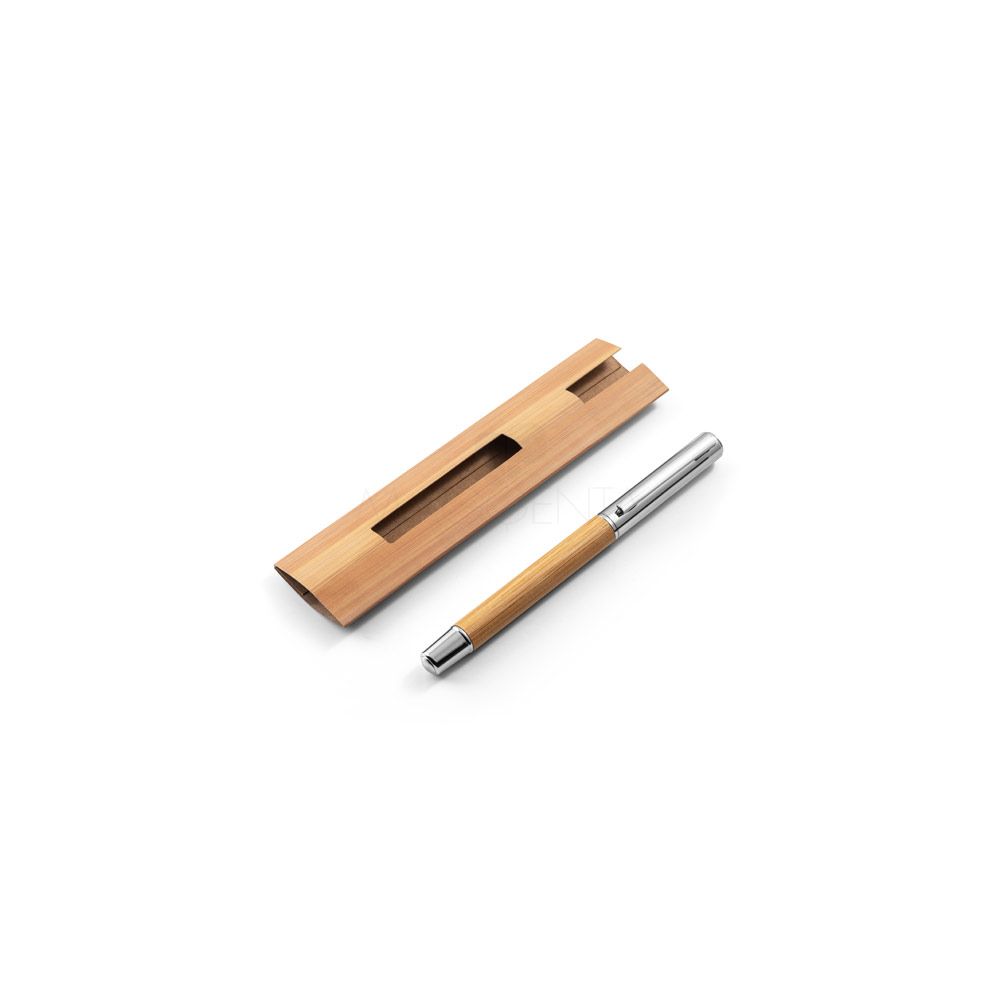 Roller em aço inox 90% reciclado e bambu com tampa. Escrita em azul. Fornecido em bolsa oferta em papel de bambu. A cor e o resultado da impressão nos materiais naturais pode variar entre produtos.