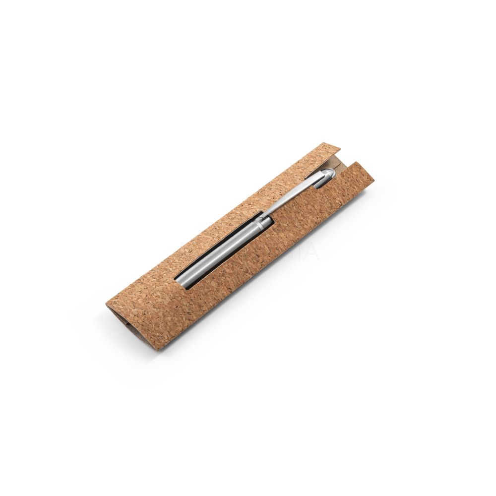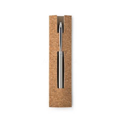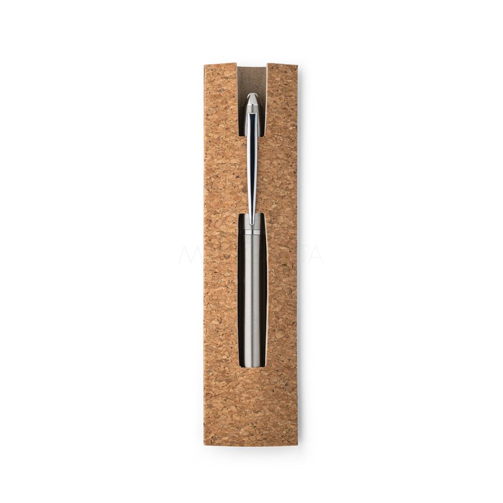 Esferográfica com corpo em aço inox 53% reciclado e clipe. A esferográfica tem escrita em preto e mecanismo twist. Fornecida numa bolsa presente em cortiça.