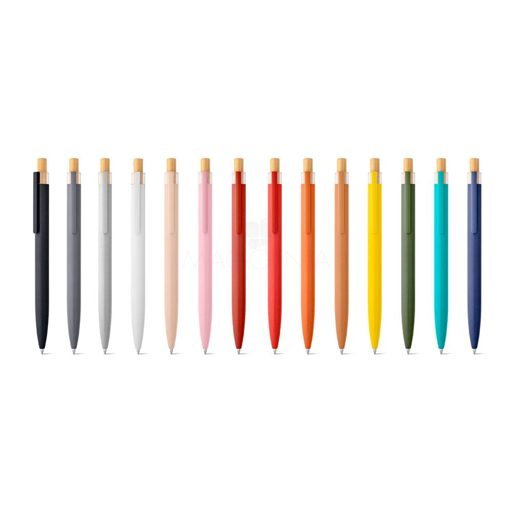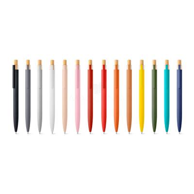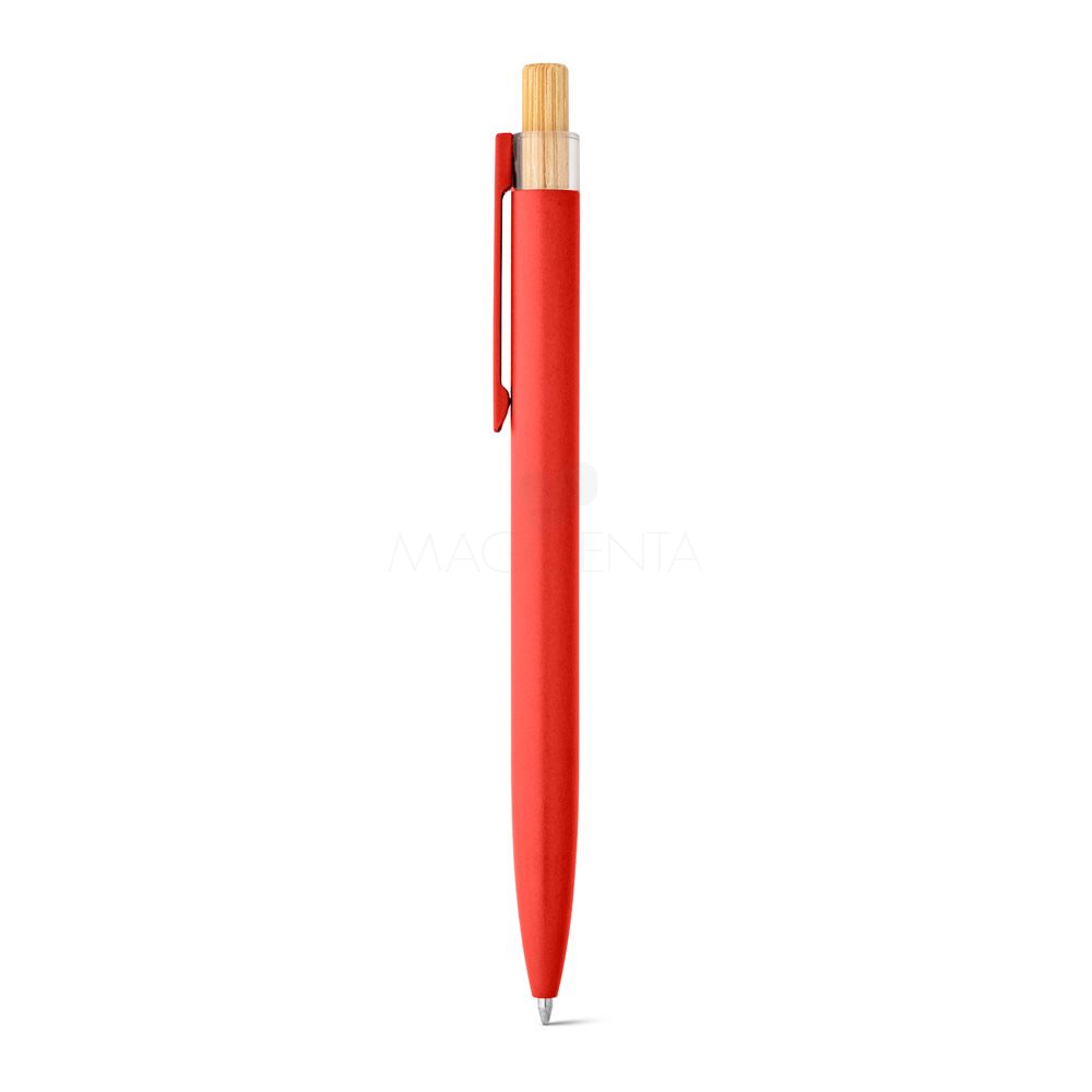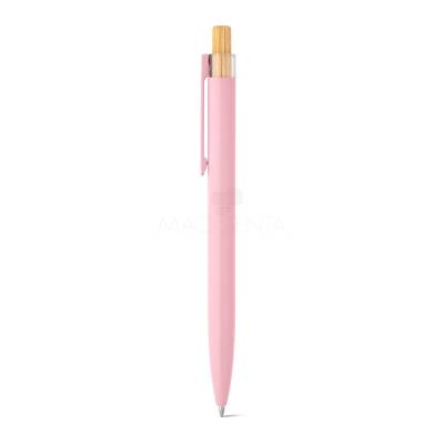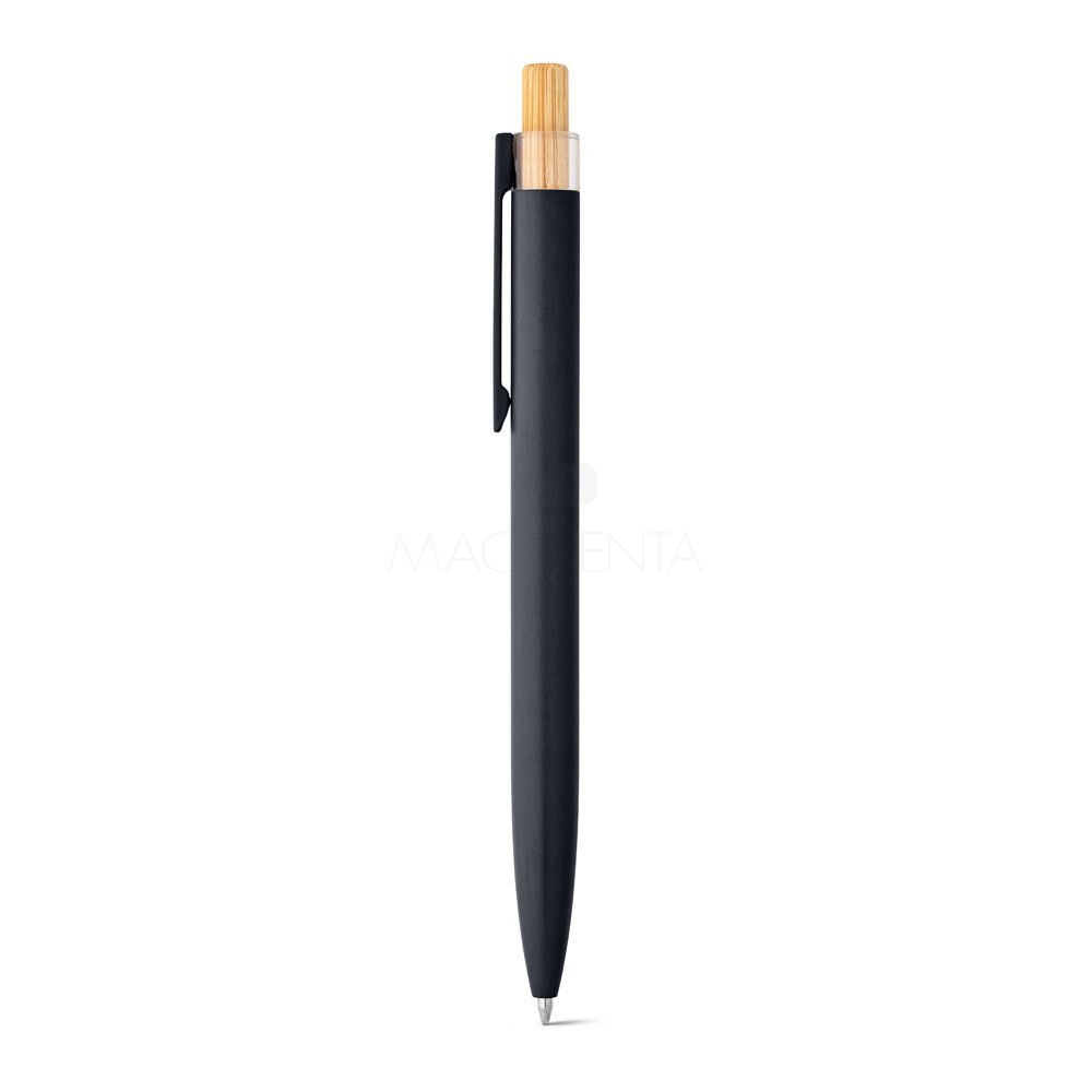 Esferográfica com corpo em alumínio 100% reciclado, topo em 100% rPET, botão em bambu e clipe de metal. Escrita em azul. A cor e o resultado da impressão nos materiais naturais pode variar entre produtos.