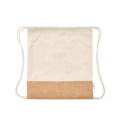 Sacola tipo mochila em 70% algodão reciclado e 30% poliéster reciclado (180 g/m²) com base em juta. Alças em algodão.
