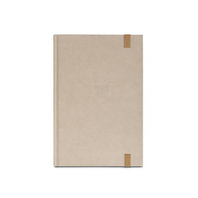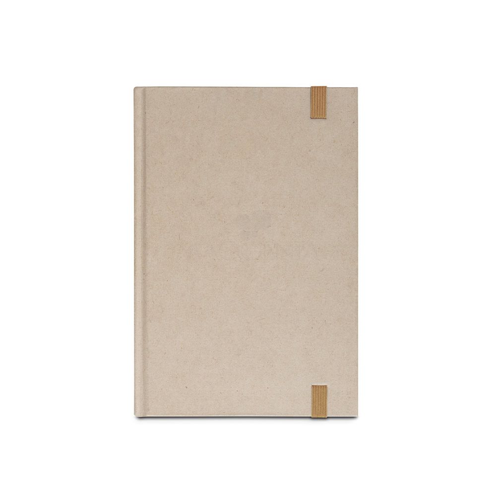 Caderno A5 de capa dura em papel à base de cana-de-açúcar (80% polpa da cana-de-açúcar). O interior contém 80 folhas pautadas em papel à base de cana-de-açúcar (80% polpa da cana-de-açúcar) (90 g/m²), fita separadora e elástico para fecho do bloco.