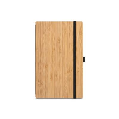 Caderno de bolso de capa e contracapa em placa de bambu e lombada em poliéster 100% reciclado (100% rPET). O interior contém 80 folhas lisas com papel reciclado, suporte para esferográfica (não inclusa) e elástico para fecho do caderno. A cor e o resultado da impressão nos materiais naturais pode variar entre produtos