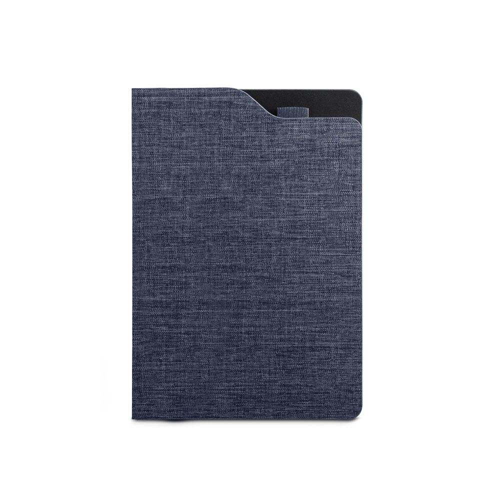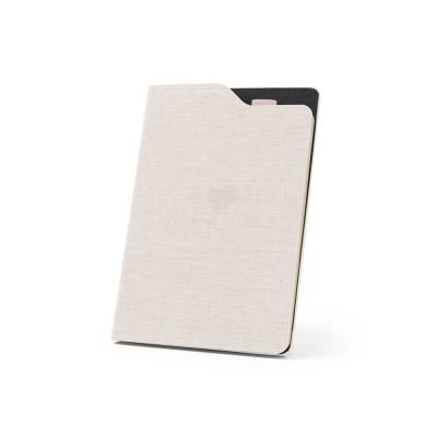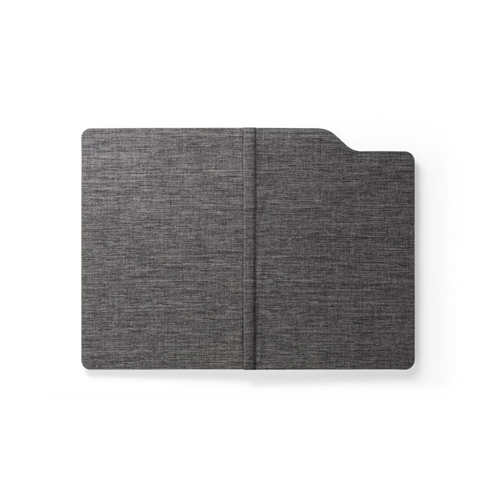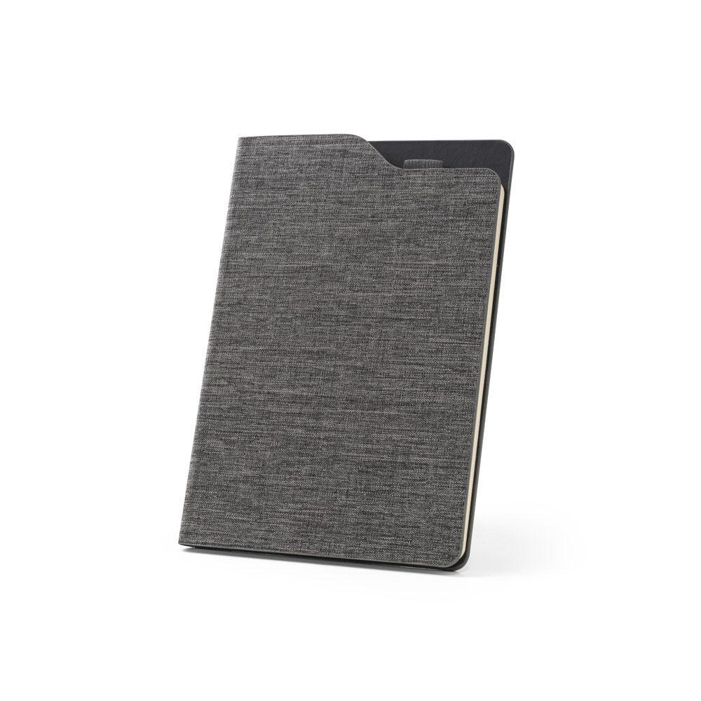 Caderno A5 de capa dura em tecido poliéster 100% reciclado (100% rPET). O interior contém 80 folhas pautadas em papel cor marfim reciclado, fita separadora e suporte de esferográficas no topo do caderno (não inclusa).