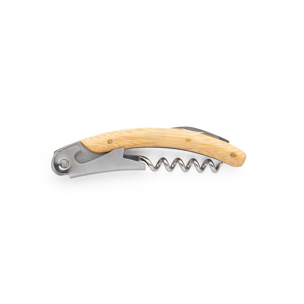 Conjunto de vinho com dois componentes em metal e bambu: um saca rolhas e um salva-gotas. Fornecido em caixa presente de papel kraft reciclado. A cor e o resultado da impressão nos materiais naturais pode variar entre produtos.