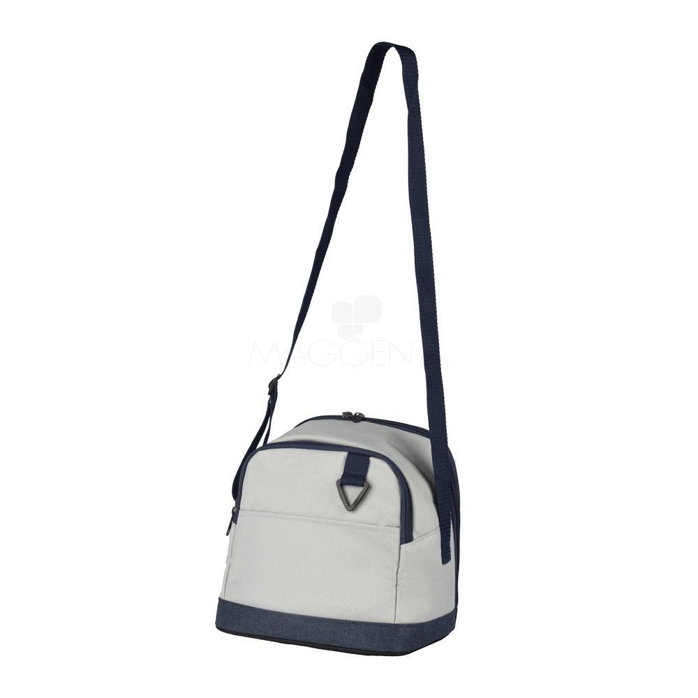 Bolsa térmica, bolso frontal, argola para chave, dois acessos ao compartimento interno, alça para regulagem e parte interna soldada.