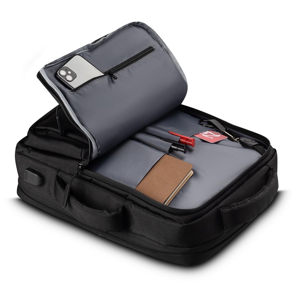 Mochila produzida em tecido de poliéster, alça de ombro e mão acolchoada,2 bolsos frontais e divisórias internas, aceita notebooks de até 15,6", porta USB na lateral da mochila, possui engate para mala de viagem.
