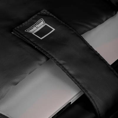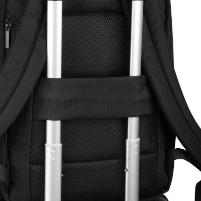 Mochila para notebook em tecido poliéster e detalhe em PU, compartimento interno para notebook de até 15,6", engate para mala de viagem, dois bolsos laterais e bolso frontal com zíper.