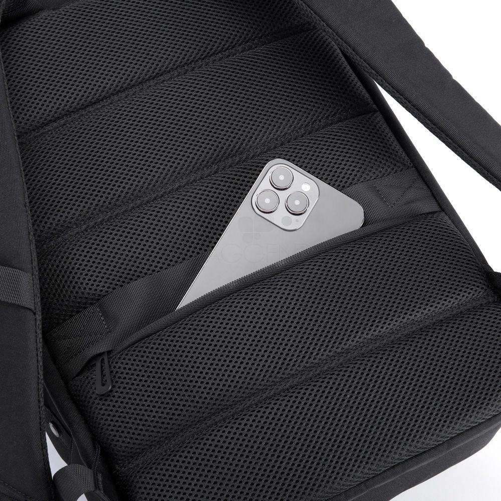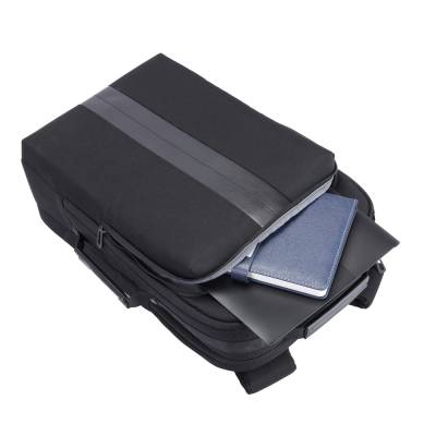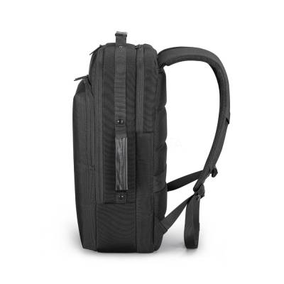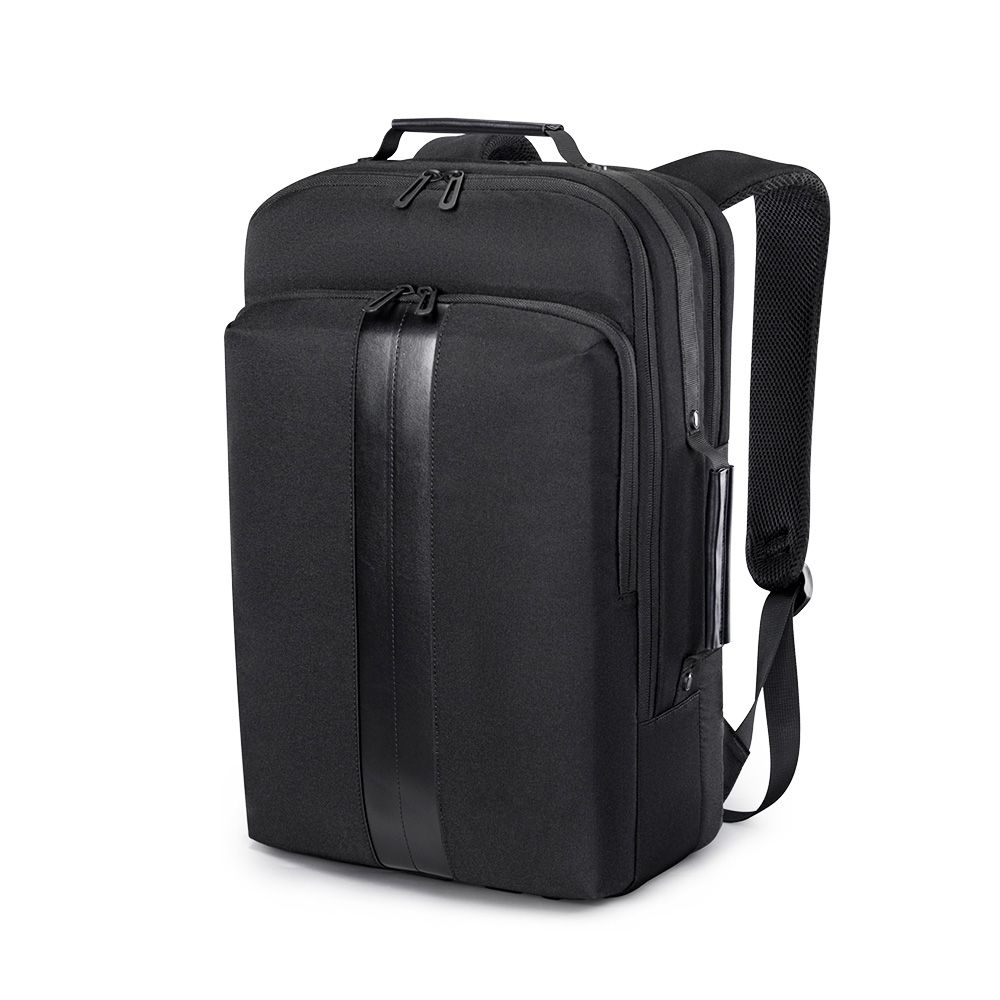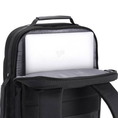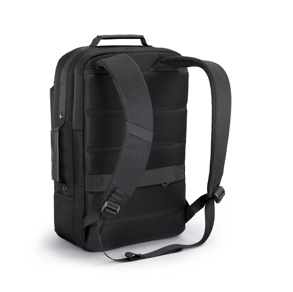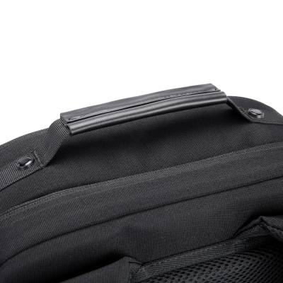 Mochila premium, produzida com couro acolchoado, alças de ombro acolchoadas, interior com divisórias com zíper para acomodar pequenos objetos, dois bolsos frontais com zíper, na parte das costas uma divisória com zíper, engate para mala de viagem, aceita notebook de até 15,6”, porta USB tipo C na lateral.