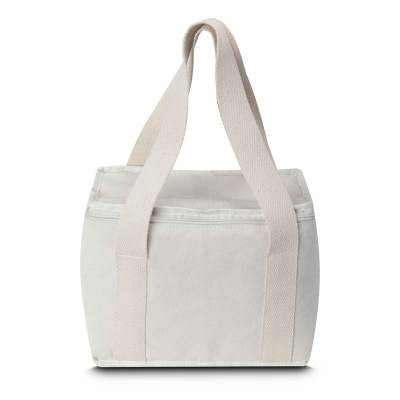 Bolsa térmica em algodão cru, bolso frontal, alça de mão, compartimento interno soldado.