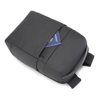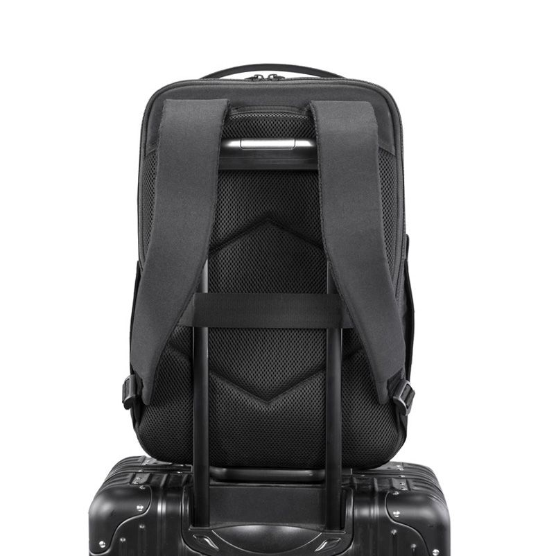 Mochila premium, produzida com poliéster acolchoado, alças de ombro acolchoadas, interior com divisórias, engate para mala de viagem, aceita notebook de até 15,6”.