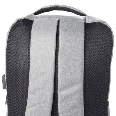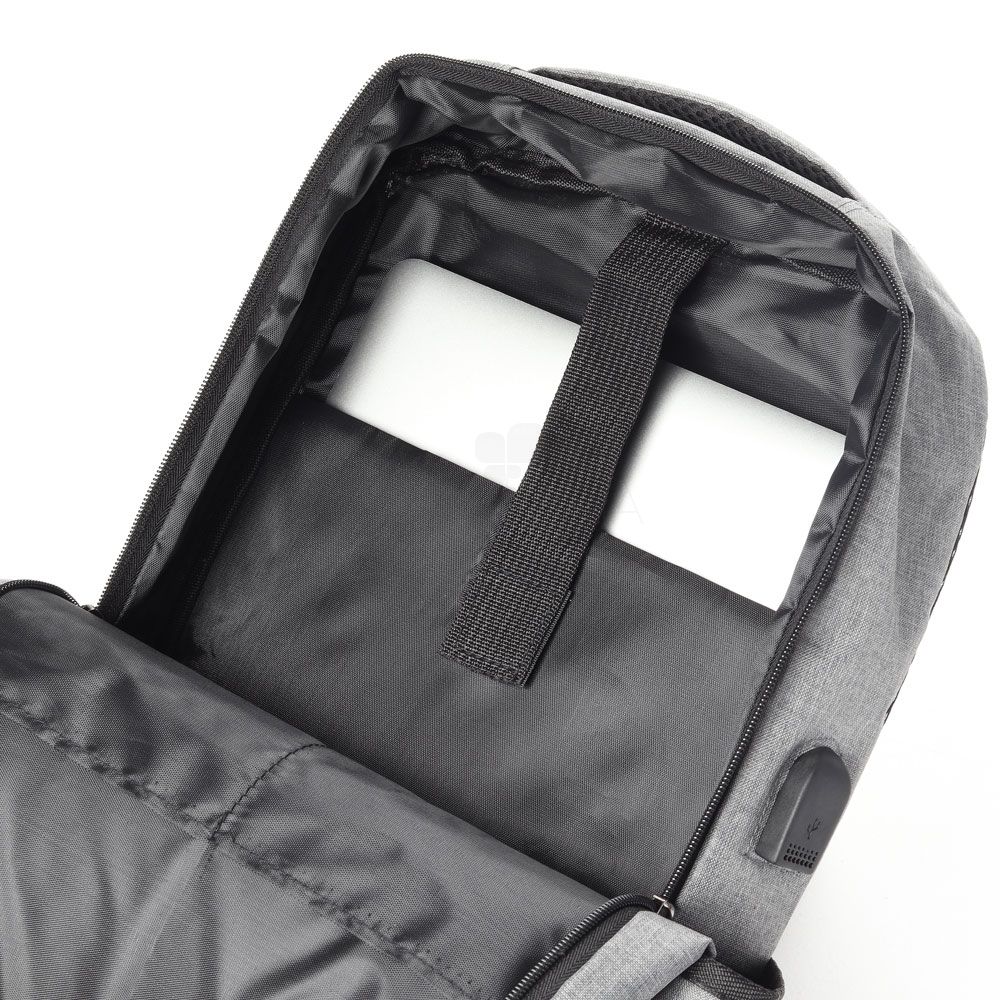 Mochila para notebook em tecido poliéster, sua parte externa contém bolso frontal com zíper, bolso pequeno na lateral direita, conector USB., alça de mão e ombro acolchoada e a parte interna com compartimento acolchoado para notebook até 15.6", porta caneta e porta objeto.
