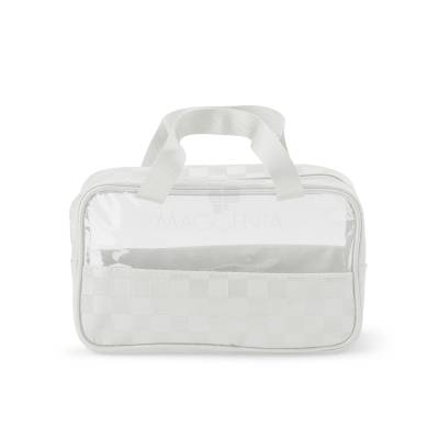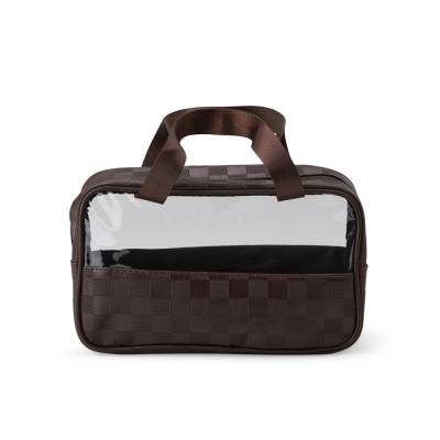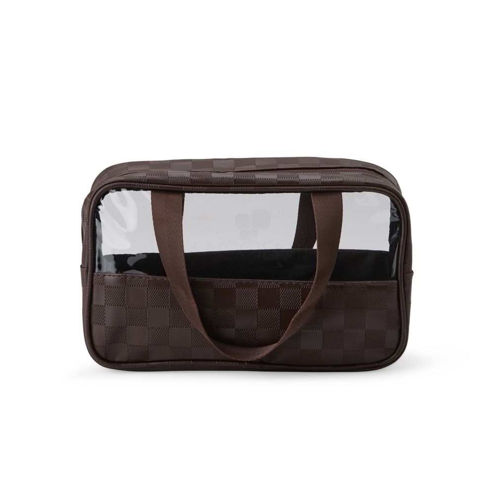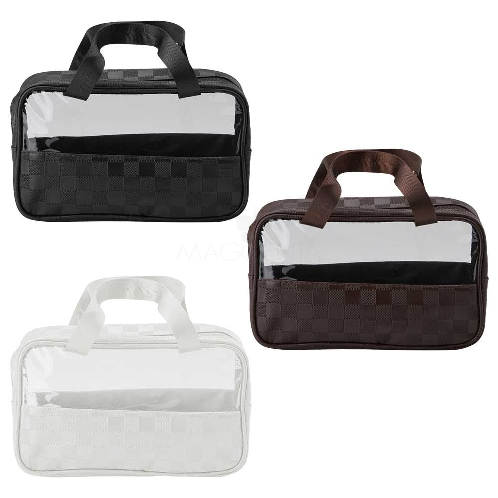 Nécessaire de PVC e couro sintético impermeável em xadrez . Possui visor transparente e duas alças laterais de mão em nylon.
