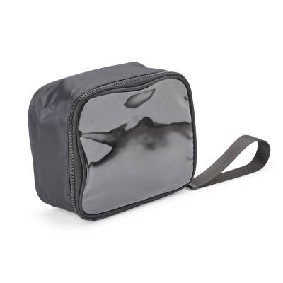 Nécessaire confeccionada em nylon, com frente em visor transparente, fechamento por zíper e alça superior. Inclui também uma alça de transporte em nylon.