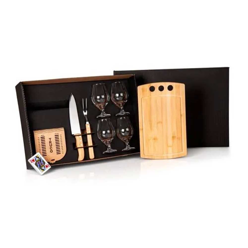 Kit para Churrasco, Cerveja e Truco. Composto por tábua com três furos em Bambu; garfo trinchante e faca 8" em Madeira/Inox; quatro copos de Cerveja em vidro; caixa para truco com jogo de cartas, marcador de tentos e jogos em MDF. Como cortesia, na faca 8" fazemos uma gravação com os cortes do boi.
