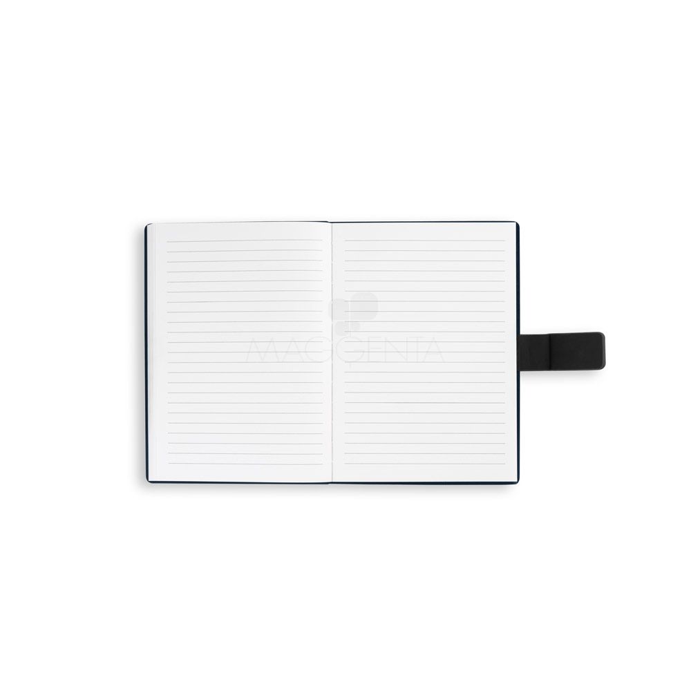 Caderno A5 com um design moderno desenvolvido para ser versátil no seu dia de trabalho. Composto por uma capa dura em 80% materiais reciclados (PU reciclado e poliéster reciclado), este caderno está estruturado em duas partes: a primeira tem 128 páginas pautadas e a segunda 128 páginas lisas, ambas feitas de um material proveniente de gestão florestal sustentável. Contém uma fita para fecho magnético do caderno.