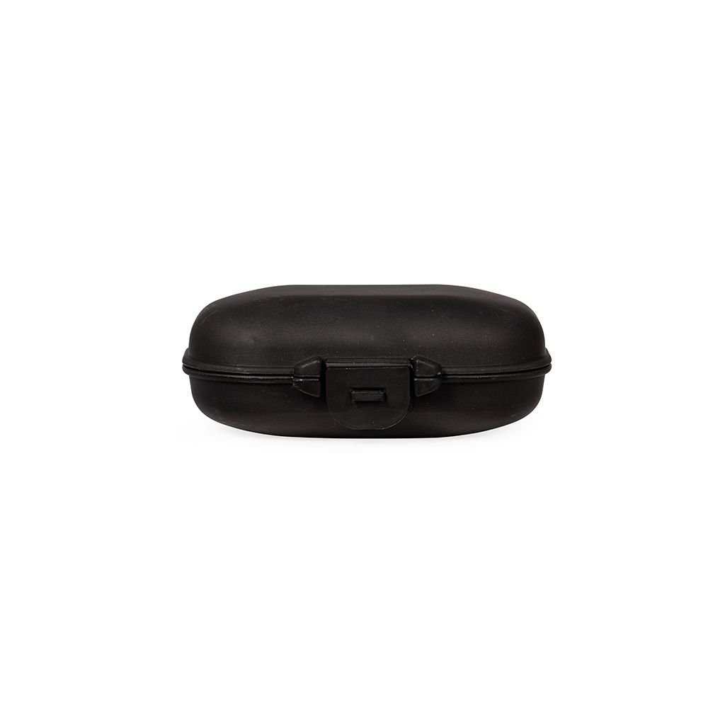 Um porta-comprimido feito em plástico, com design compacto e compartimento removível com quatro divisórias, o que facilita a limpeza e oferece mais opções para organizar medicamentos ou pequenos objetos.