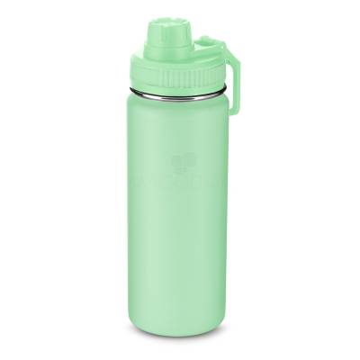 Garrafa térmica em aço inox com parede dupla Isolada a vácuo com capacidade de 570 ml. Tampa rosqueável com anel de silicone, alça plástica em formato de mosquetão e bico rosqueável para fácil acesso. Design com frisos na tampa e pintura a pó.