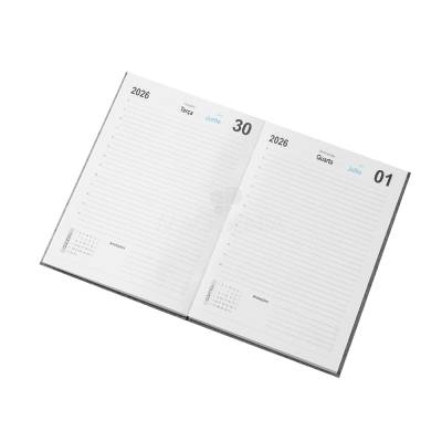 Agenda diária 2026 com capa dura com revestimento em linho. Contém páginas dedicadas a dados pessoais, calendários 2026 a 2028, planejamento diário de 2026 e lista de códigos DDI.