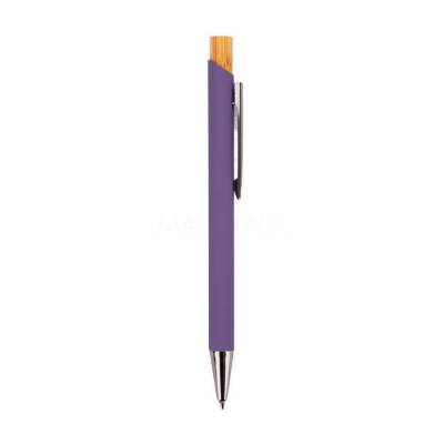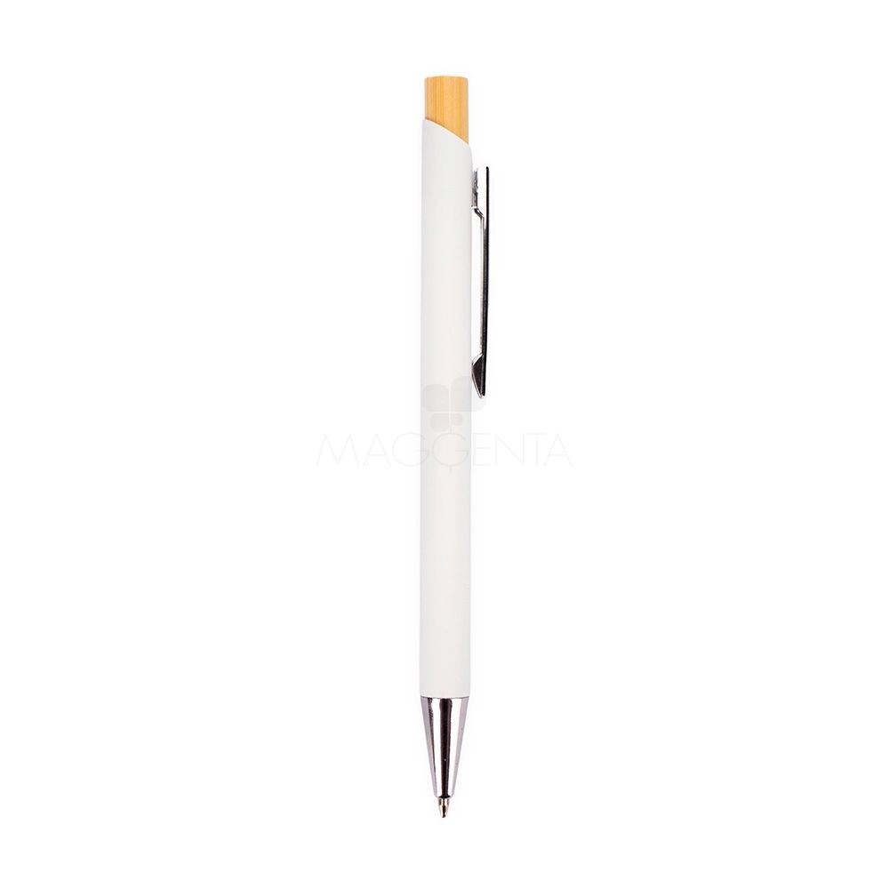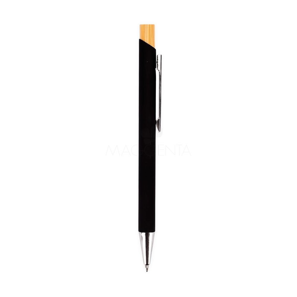 Caneta esferográfica com carga azul de 1.0mm. Possui construção metálica e acionamento por clique em bambu, o que proporciona uma pegada leve e maior precisão durante o uso.