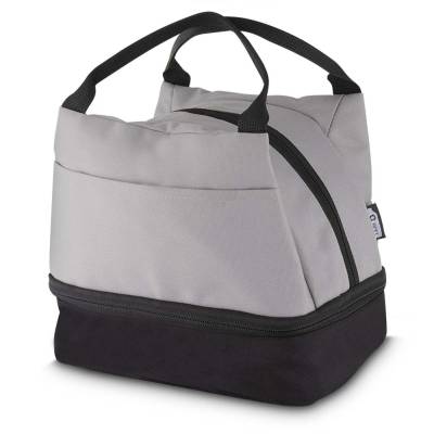 Bolsa térmica em tecido PET Reciclado com 2 compartimentos térmicos costurados, bolso frontal e alça de mão.