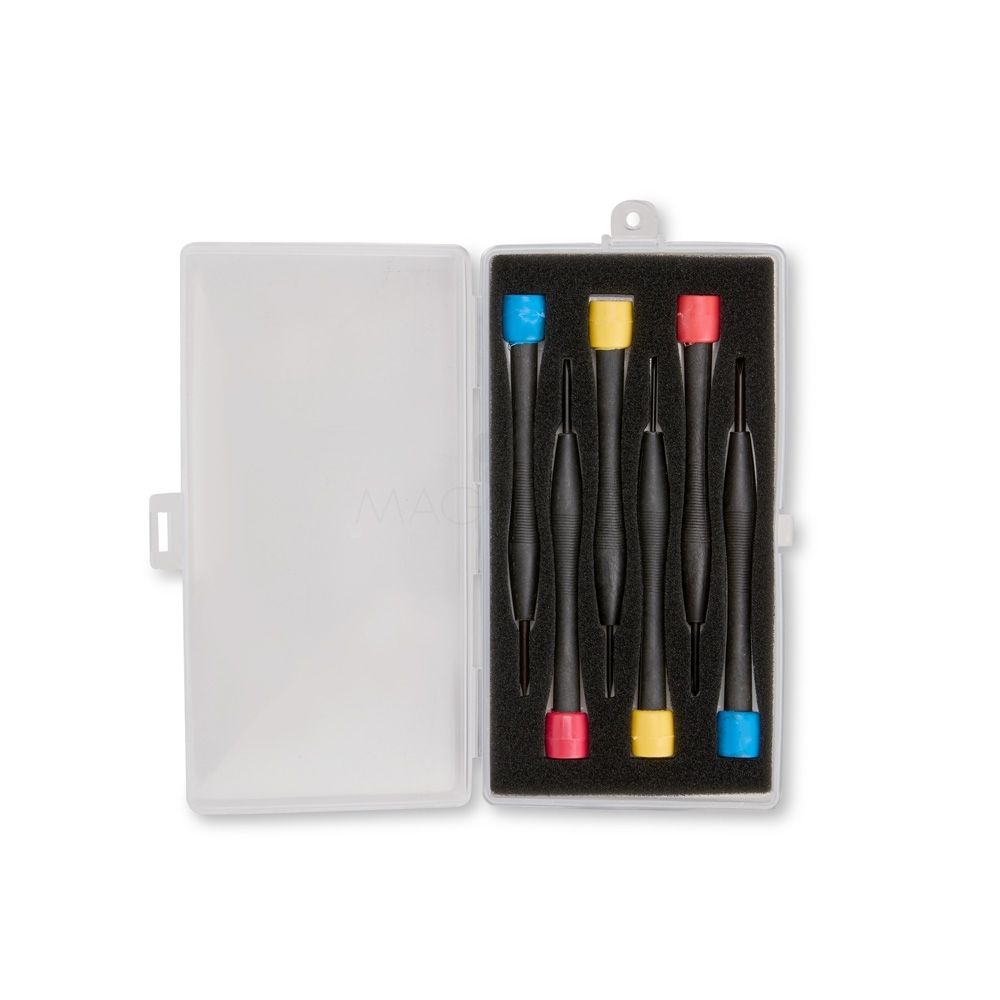 Kit de ferramentas com seis chaves com cabo plástico e pontas metálicas. Contém quatro chaves de fenda e duas chaves Phillips com pontas em tamanhos diferentes. Acompanha estojo plástico com espuma removível para acomodar as peças.