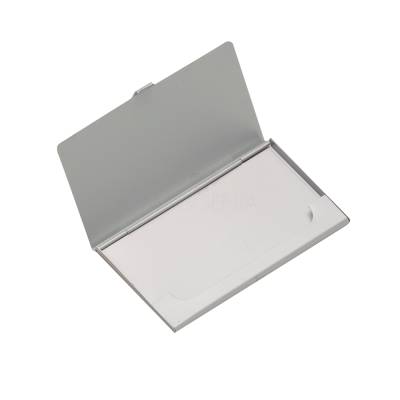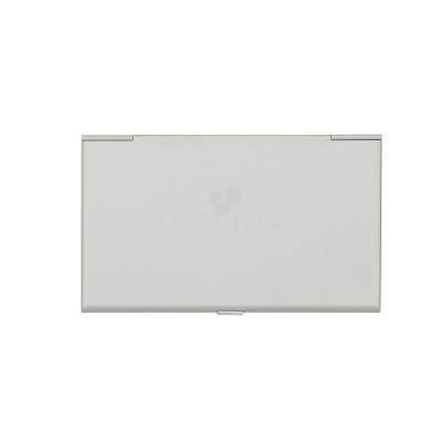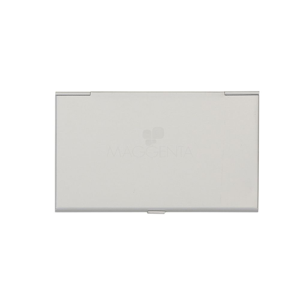 Porta cartão reproduzida em alumínio, com acabamento liso em ambos os lados. Apresenta uma superfície fosca, proporcionando uma estética moderna e sofisticada.