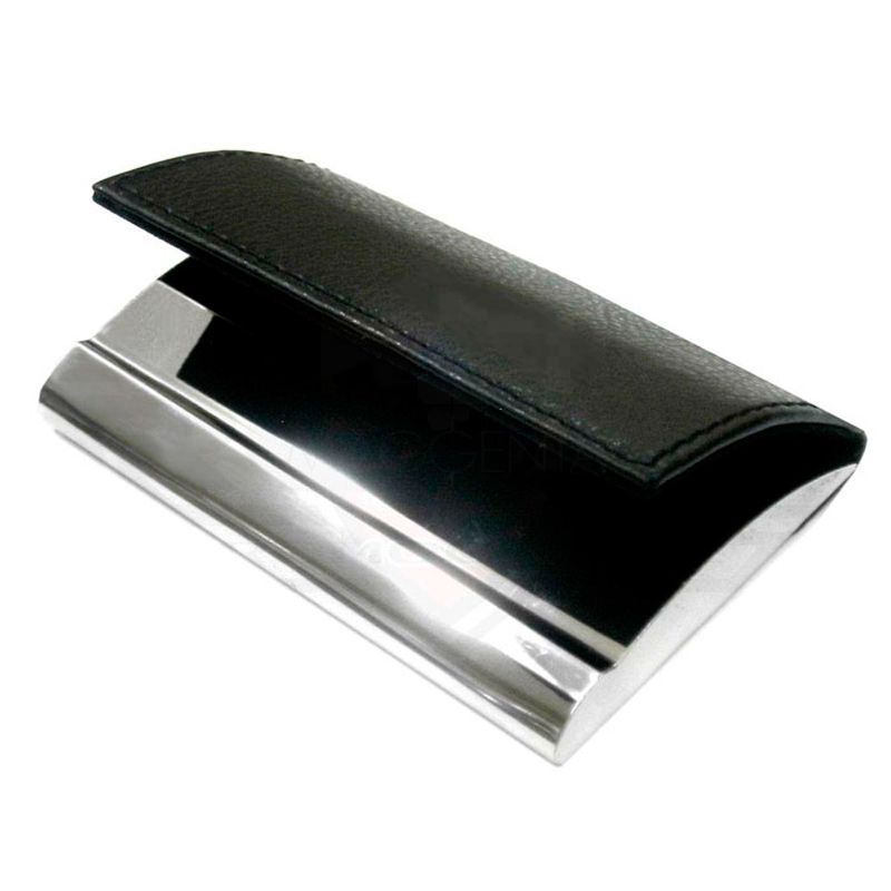Porta cartão personalizado de metal com detalhe em couro sintético.