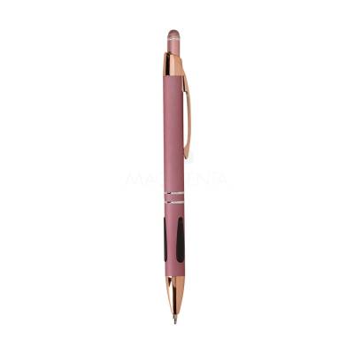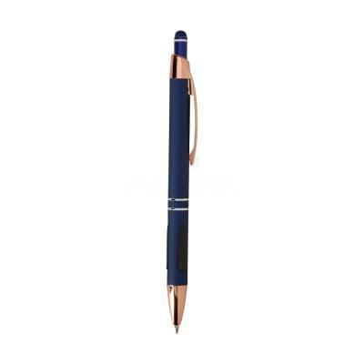 Caneta em metal com detalhes emborrachados, carga esferográfica azul de 1.0mm e acionamento por clique com acabamento emborrachado que permite seu uso como uma caneta touch para interação com dispositivos de tela sensível ao toque.