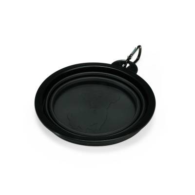 Tigela retrátil para pets feita em silicone com borda plástica equipada com encaixe para mosquetão e capacidade de até 350ml. Acompanha mosquetão metálico para facilitar o transporte.