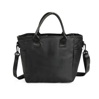 Bolsa térmica com capacidade de até 13 litros. Confeccionada em Oxford resistente à água, possui compartimento interno com revestimento térmico em PEVA e fechamento em zíper. Conta ainda com bolso frontal com plaquinha de couro sintético fixada com velcro, um par de bolsos laterais e duas alças fixas para transporte, além de uma alça transversal regulável com mosquetões para encaixe nas fivelas laterais da bolsa.