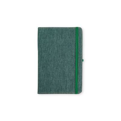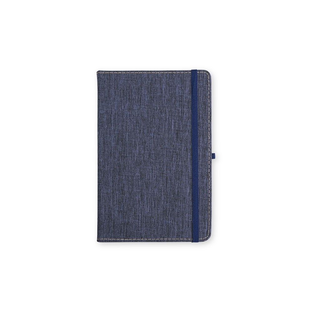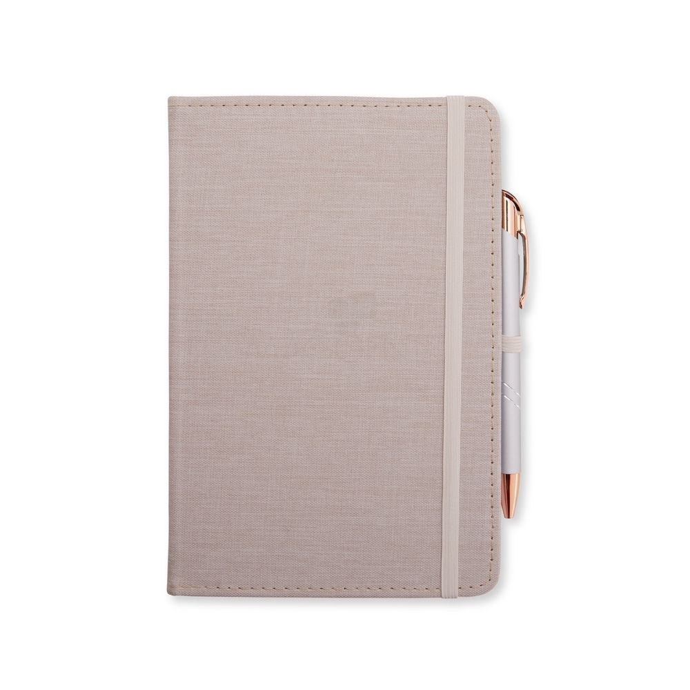 Caderneta com capa dura em linho, fechamento em elástico, marca-páginas em fita de cetim e porta-caneta elástico. Possui cerca de 80 folhas brancas pautadas.