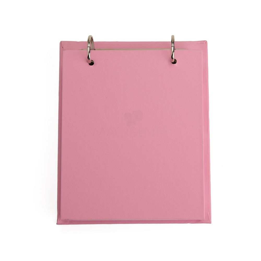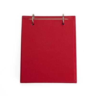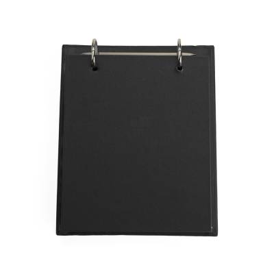 Bloco de anotações de mesa com trilho de ferro e capa dura em percalux. Possui aproximadamente 150 folhas brancas sem pauta com área destacável.
