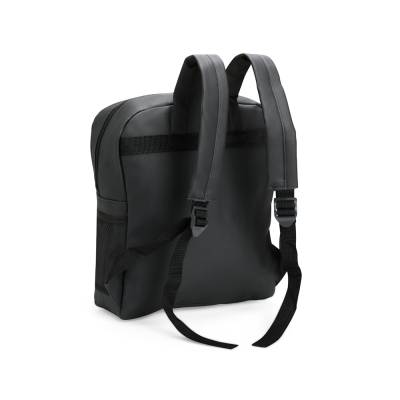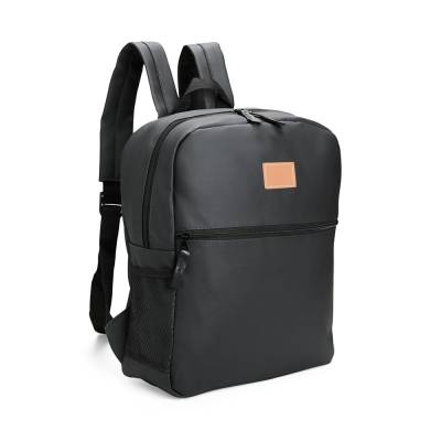 Mochila feita em couro sintético impermeável, com fechamento em zíper e capacidade máxima de 20 litros. Apresenta divisória interna, ideal para notebooks de até 14 polegadas. Conta também com um bolso frontal com uma plaquinha costurada e dois bolsos laterais em tela feitos em nylon.