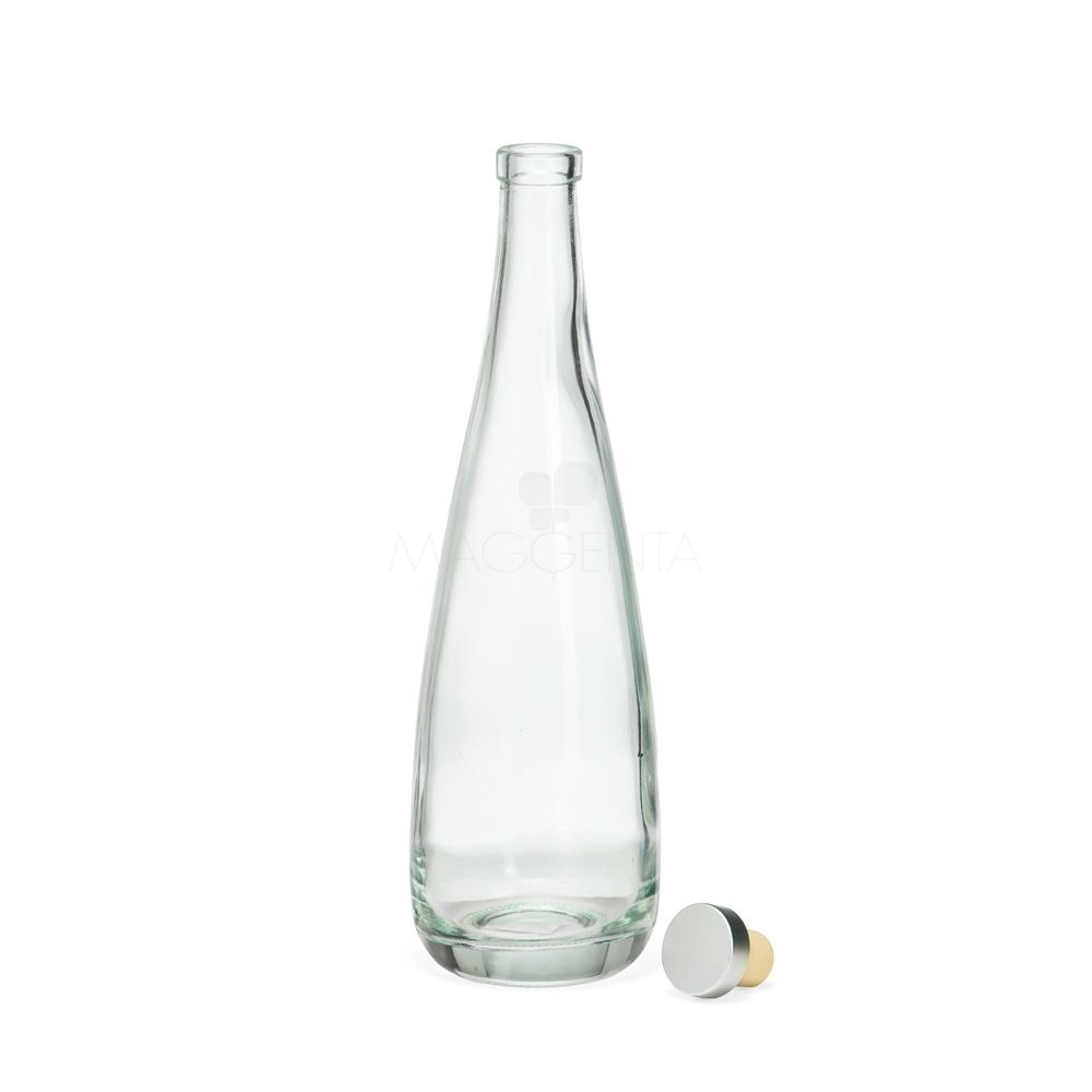 Garrafa de vidro com tampa rolha em material sintético e capacidade máxima de até 550ml.