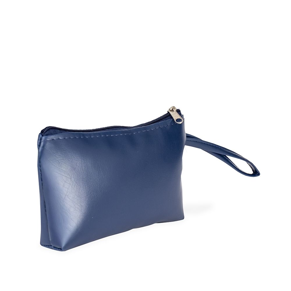 Nécessaire em couro sintético resistente à água, fechamento em zíper e alça lateral para transporte.