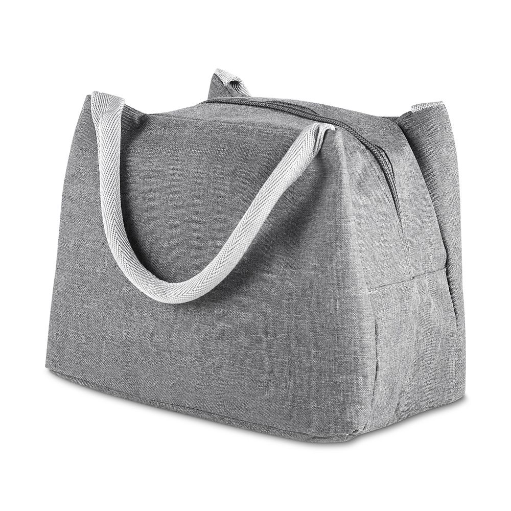 Bolsa térmica com alça de mão, confeccionada em poliéster 300D na parte externa e alumínio com manta térmica no interior. Modelo costurado, puxador de zíper em formato de colher, sem solda e capacidade para 5,6 litros.