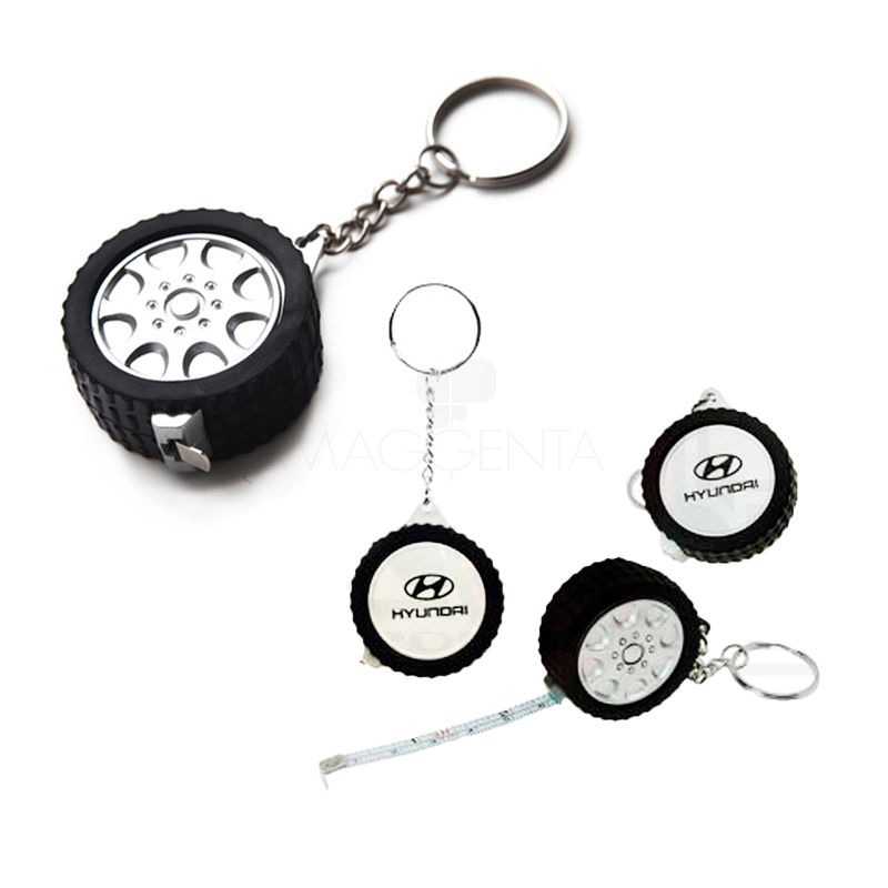 Brinde Chaveiro Trena de 1 metro formato de pneu, material de plástico.