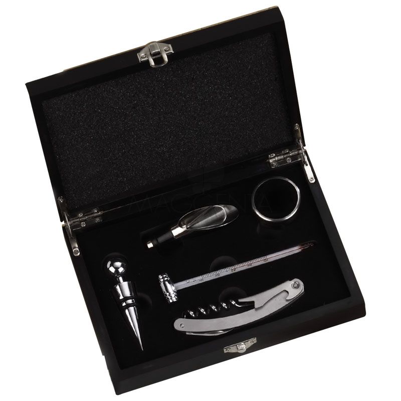 Kit vinho com 5 peças personalizado com embalagem diferenciada. Possui 1 abridor saca rolha, 1 tampa de bico, 1 corta gotas, 1 termômetro e 1 Wine collar. Ideal para brindes promocionais e eventos corporativos.