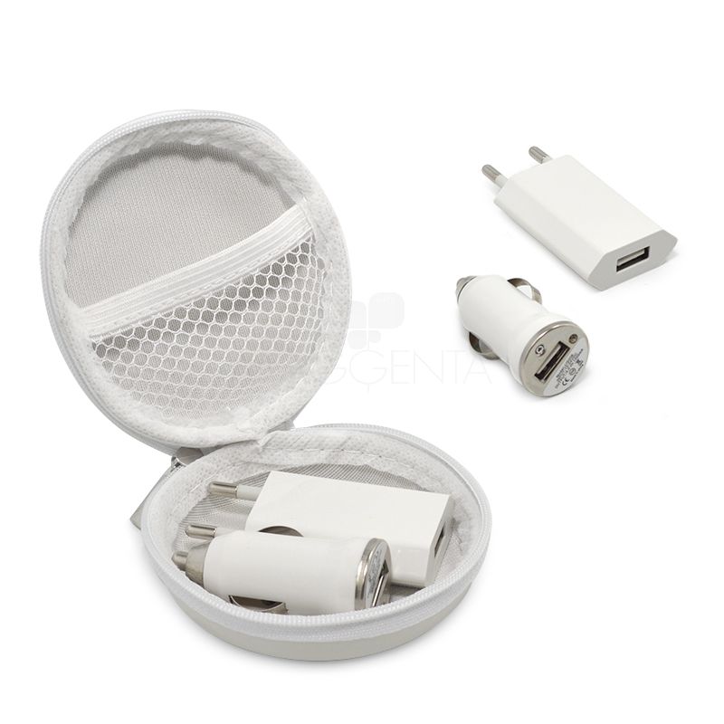 Kit portátil com estojo para brindes personalizados. Conteúdo: *1 Adaptador veícular * 1 Adaptador para tomada com saida USB. Gravação em Silk.