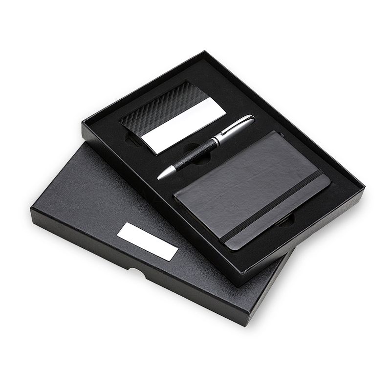 Com estojo de papelão com tampa e parte interna revestida de espuma. Contém: porta cartão de couro sintético texturizado com detalhes prata brilhante, caneta metal fosca com detalhe emborrachado preto, caderneta tipo moleskine em couro sintético com aproximadamente 80 folhas amarelas pautadas. Acompanha placa metálica para gravação.