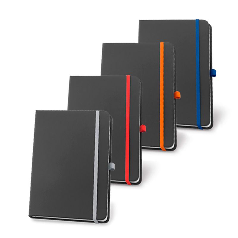 Bloco de anotações com capa dura produzido em material sintético, possui 80 folhas pautadas, elástico colorido para fechamento fechamento e porta caneta.