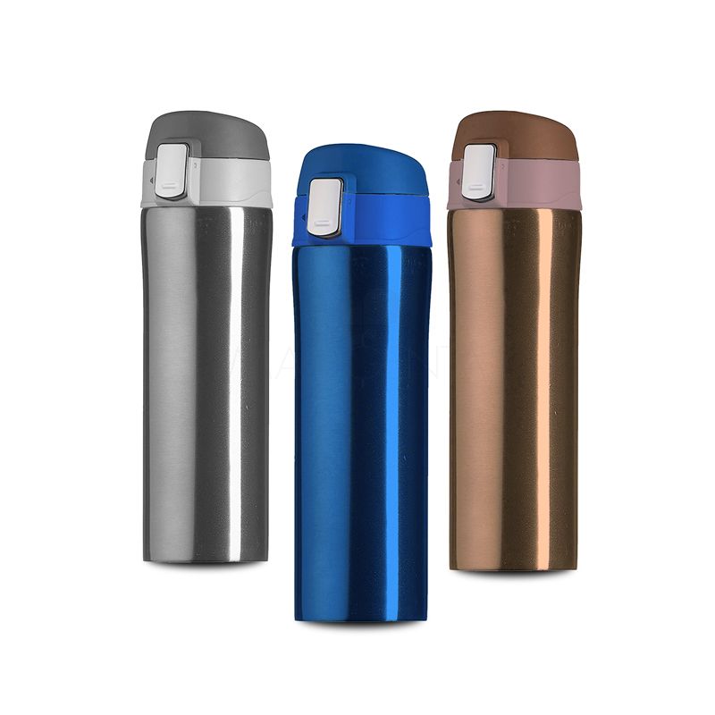 Squeeze produzido em metal com parede dupla, capacidade de 450ml. Possui interior revestido em inox, tampa com sistema de vedação evitando o vazamento do líquido, botão central para abertura e trava lateral.