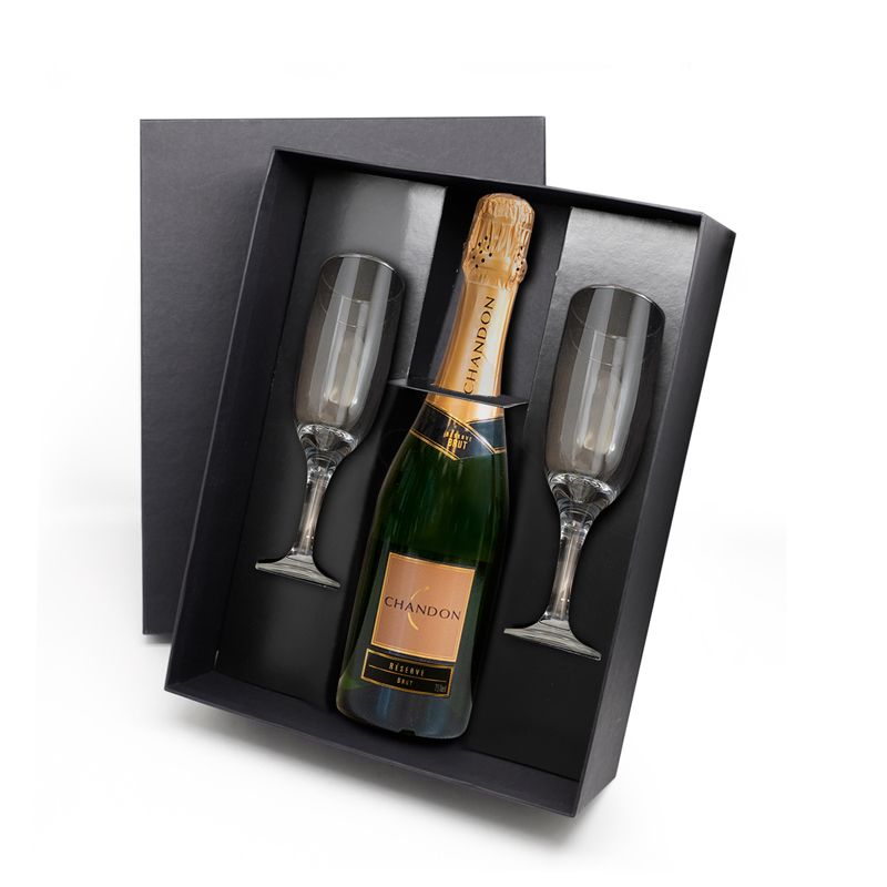 Kit Chandon BRUT 750 ml com duas taças personalizadas de vidro com capacidade para 180 ml. Possui embalagem elegante com 1 Chandon BRUT 750 ml, teor Alcoólico: 11,8% com paladar frutado, mostra notas florais, e delicado aroma de pão fresco. A elegância garantida pelo frescor e a perlage fina envolvem a boca e associam-se às notas de frutas cítricas e secas, e duas taças de vidro com haste curta e bojo reforçado. Brinde ideal para ser desfrutado em encontros, baladas e ocasiões informais.