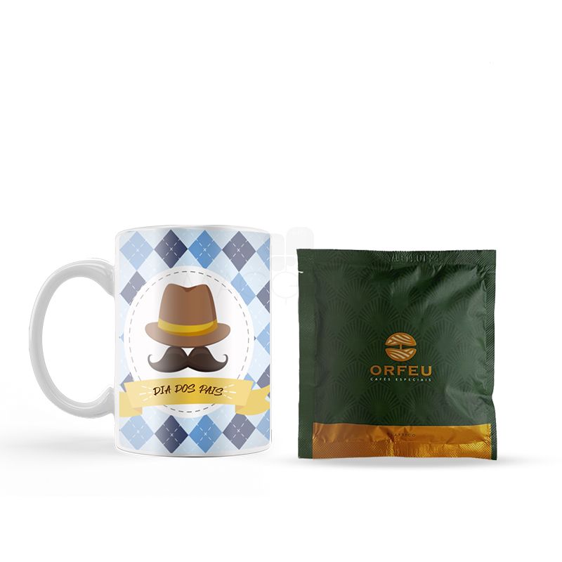 Kit Gourmet com caneca de porcelana personalizada mais 3 sachês de café Orfel clássico torra média, embalados em uma caixa de papel Colorplus. Perfeito para sua campanha de endomarketing e/ou premiação de colaboradores